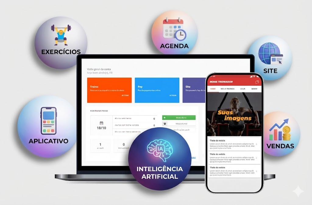 O sistema com APP e IA para personal trainer, estúdios e academias.